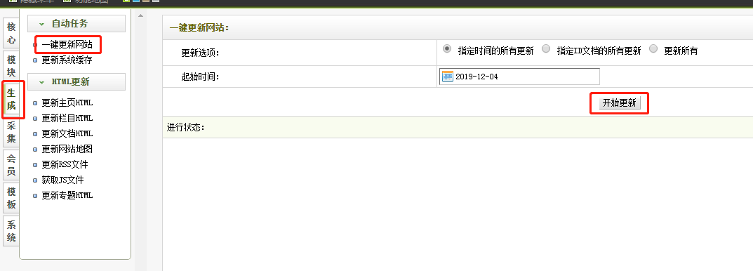 這樣就算上傳成功了,保存后點擊右邊的生成按鈕,選擇一件更新網站或者更新欄目等等,點擊開始更新,更新成功即可